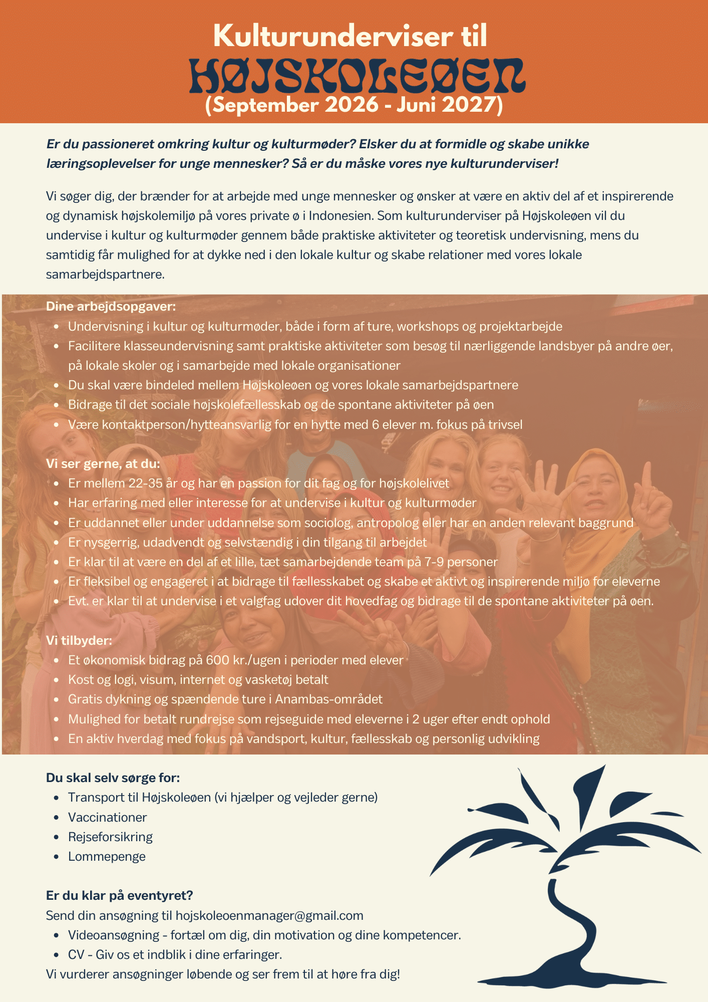 Vi søger løbende energiske og passionerede mennesker til at være en del af vores team her på Højskoleøen. Teamet består af 7-9 personer. Er du måske en af dem?