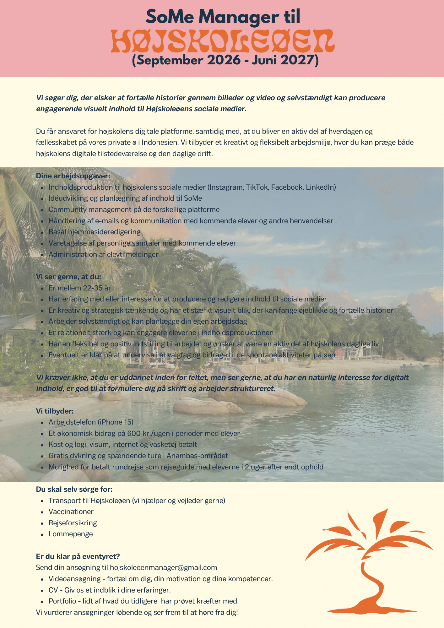 – Så send os en videoansøgning og dit CV på hojskoleoenmanager@gmail.com