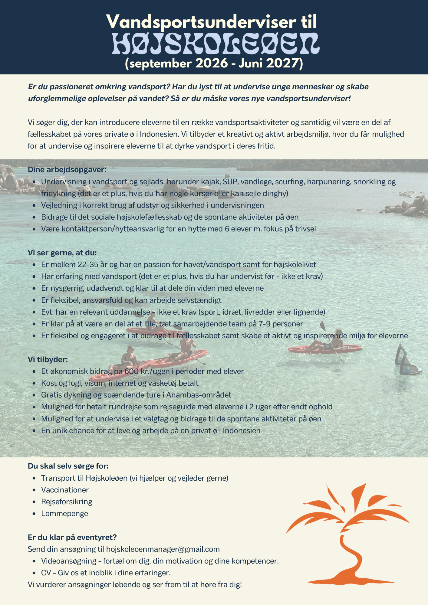 Se, hvilke ledige stillinger vi har nedenfor og send os en mail på hojskoleoenmanager@gmail.com med dit CV og din videoansøgning, hvis dit næste eventyr skal være sammen med os. Angiv, hvilken stilling, du søger til og hvilke relevante kompentencer, du besidder, så vi kan lære dig bedre at kende.